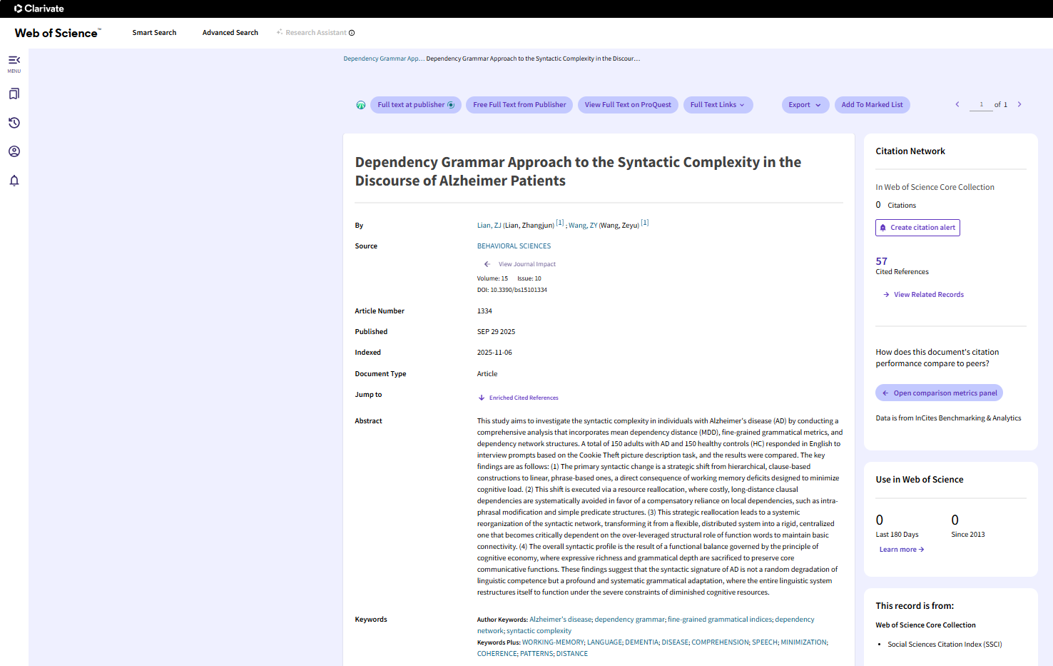 近日,雷竞技RAYBET副教授廉张军博士与2023级硕士研究生王泽宇合作完成的研究论文“Dependency Grammar Approach to the Syntactic Complexity in the Discourse of Alzheimer Patients”在SSCI索引期刊Behavioral Sciences发表。