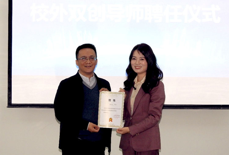 授牌仪式后,冯正斌为李盼盼颁发了校外双创导师聘书,并向西安思想家语言学校管理团队一行介绍了我院大学生创新创业取得成绩以及学院对学生创新创业的扶持政策。